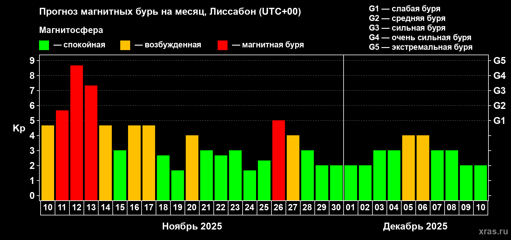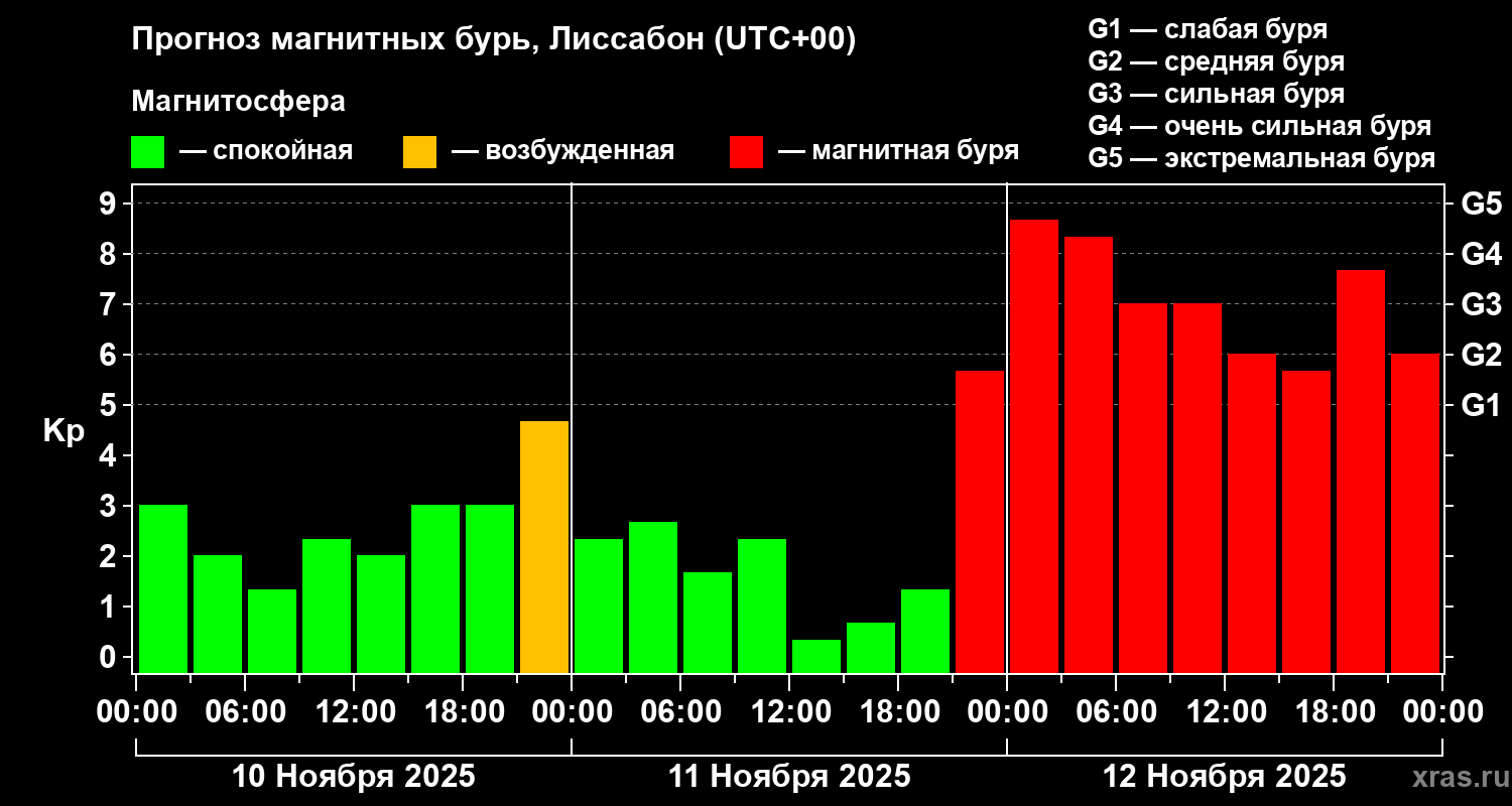 Прогноз магнитных бурь в Лиссабоне — 10 ноября 2025 года