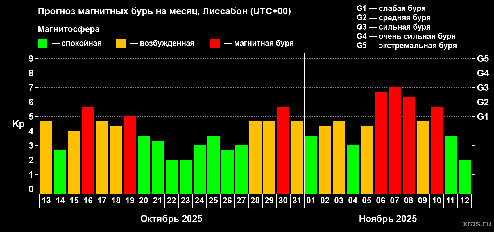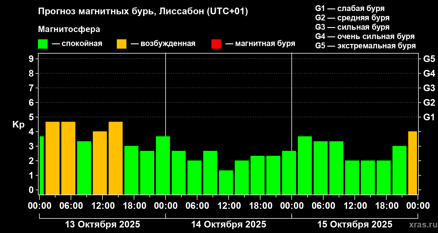 Прогноз магнитных бурь в Лиссабоне на 13 октября 2025 года