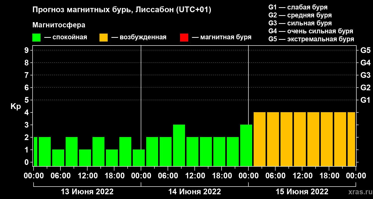 Прогноз магнитных бурь в Лиссабоне — 13 июня 2022 года