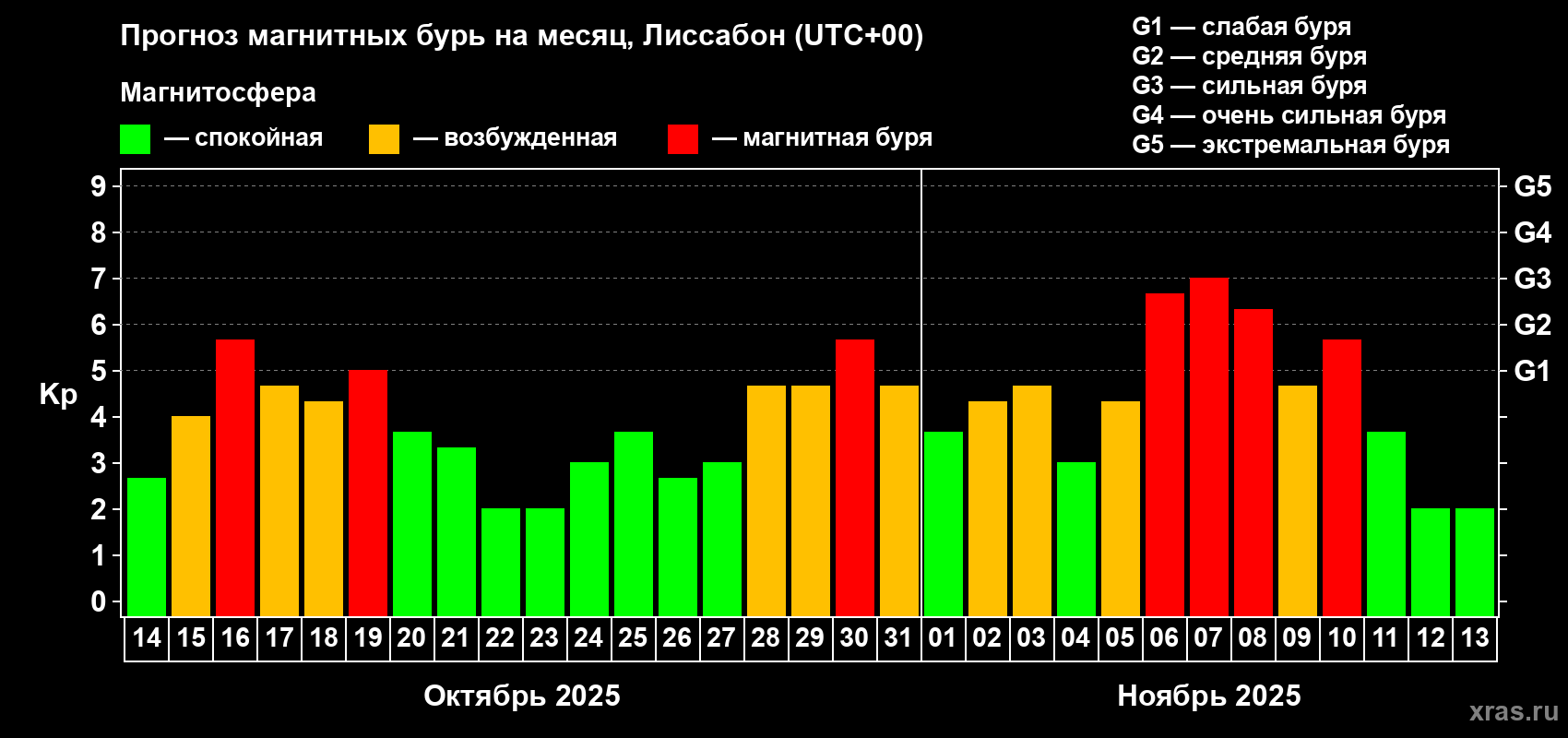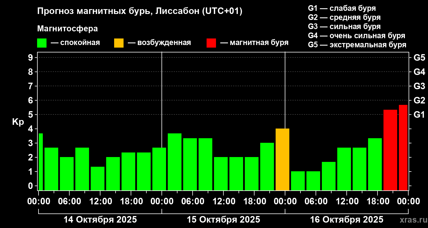 Прогноз магнитных бурь в Лиссабоне — 14 октября 2025 года