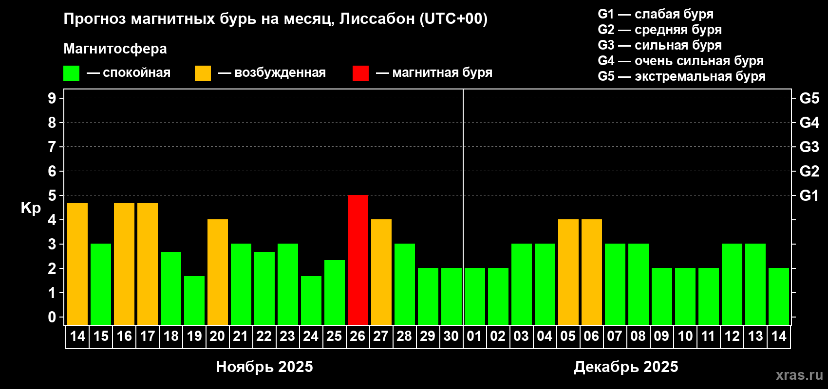 Прогноз магнитных бурь в Лиссабоне на 14 ноября 2025 года