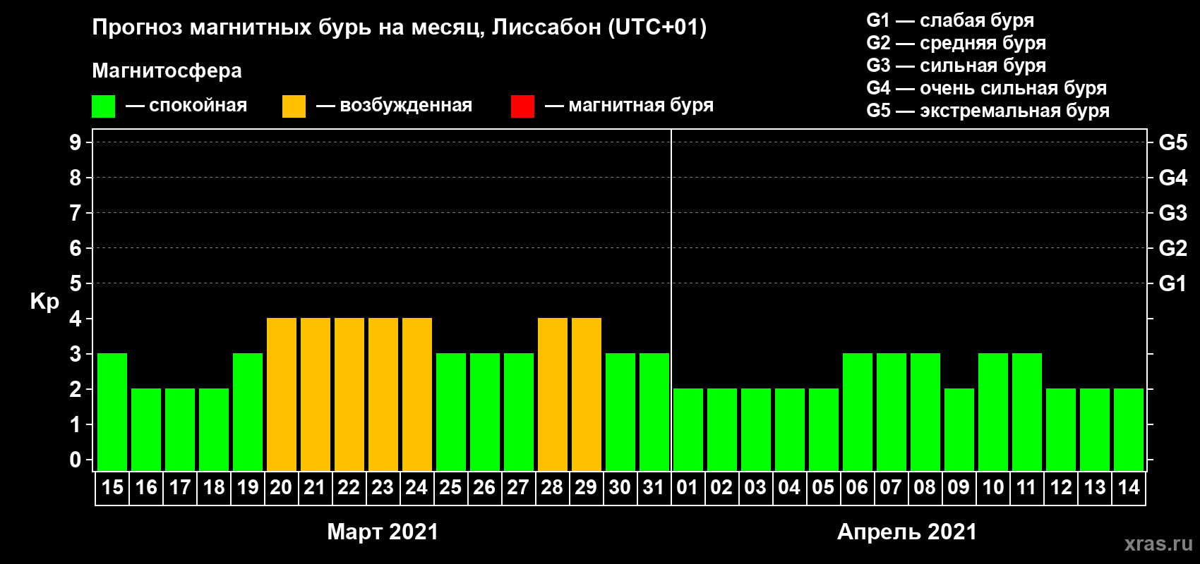 Прогноз максимального суточного геомагнитного индекса Kp на 1 месяц (31 день) с 15 марта по 14 апреля 2021 г