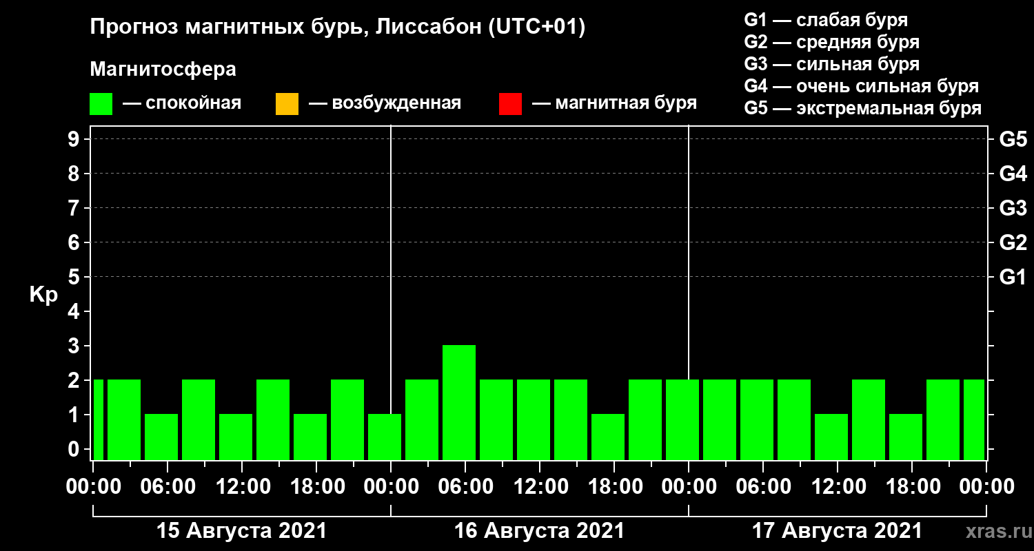 Прогноз магнитных бурь в Лиссабоне — 15 августа 2021 года