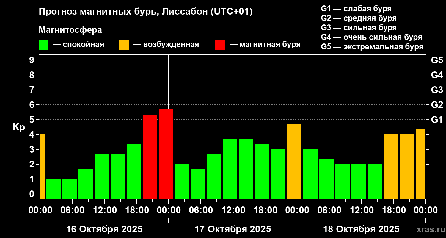Прогноз магнитных бурь в Лиссабоне — 16 октября 2025 года