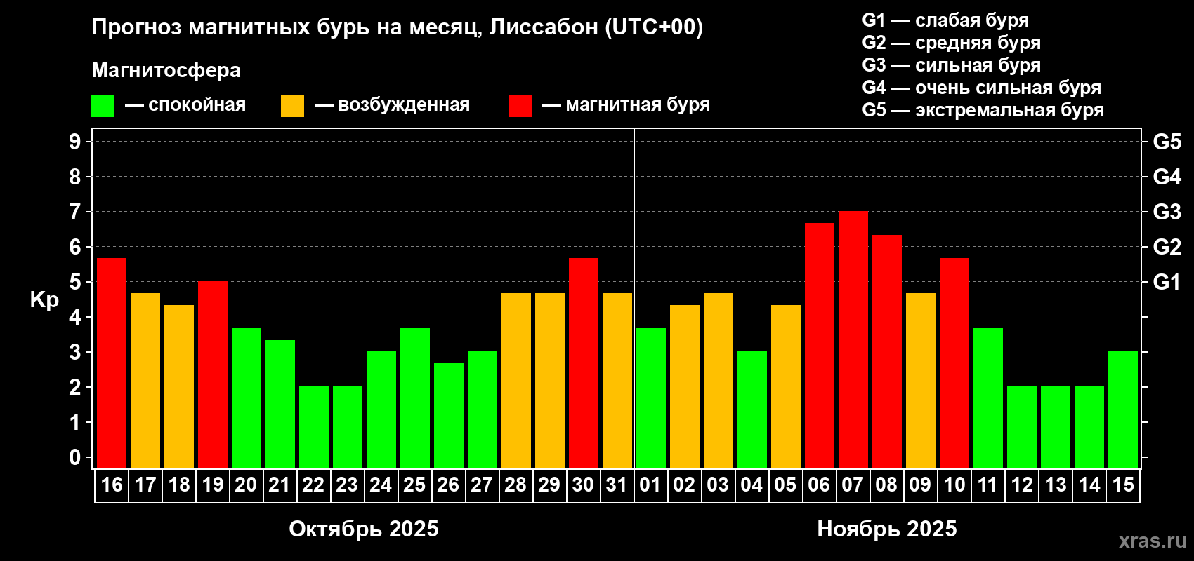 Прогноз максимального суточного геомагнитного индекса Kp на 1 месяц (31 день) с 16 октября по 15 ноября 2025 г