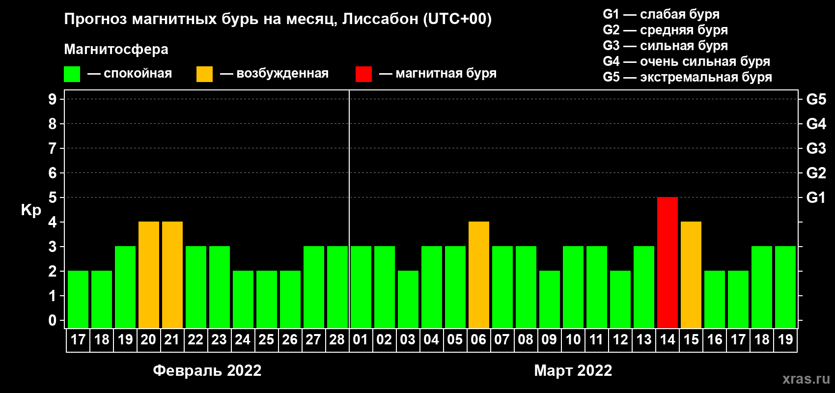 Прогноз максимального суточного геомагнитного индекса Kp на 1 месяц (31 день) с 17 февраля по 19 марта 2022 г