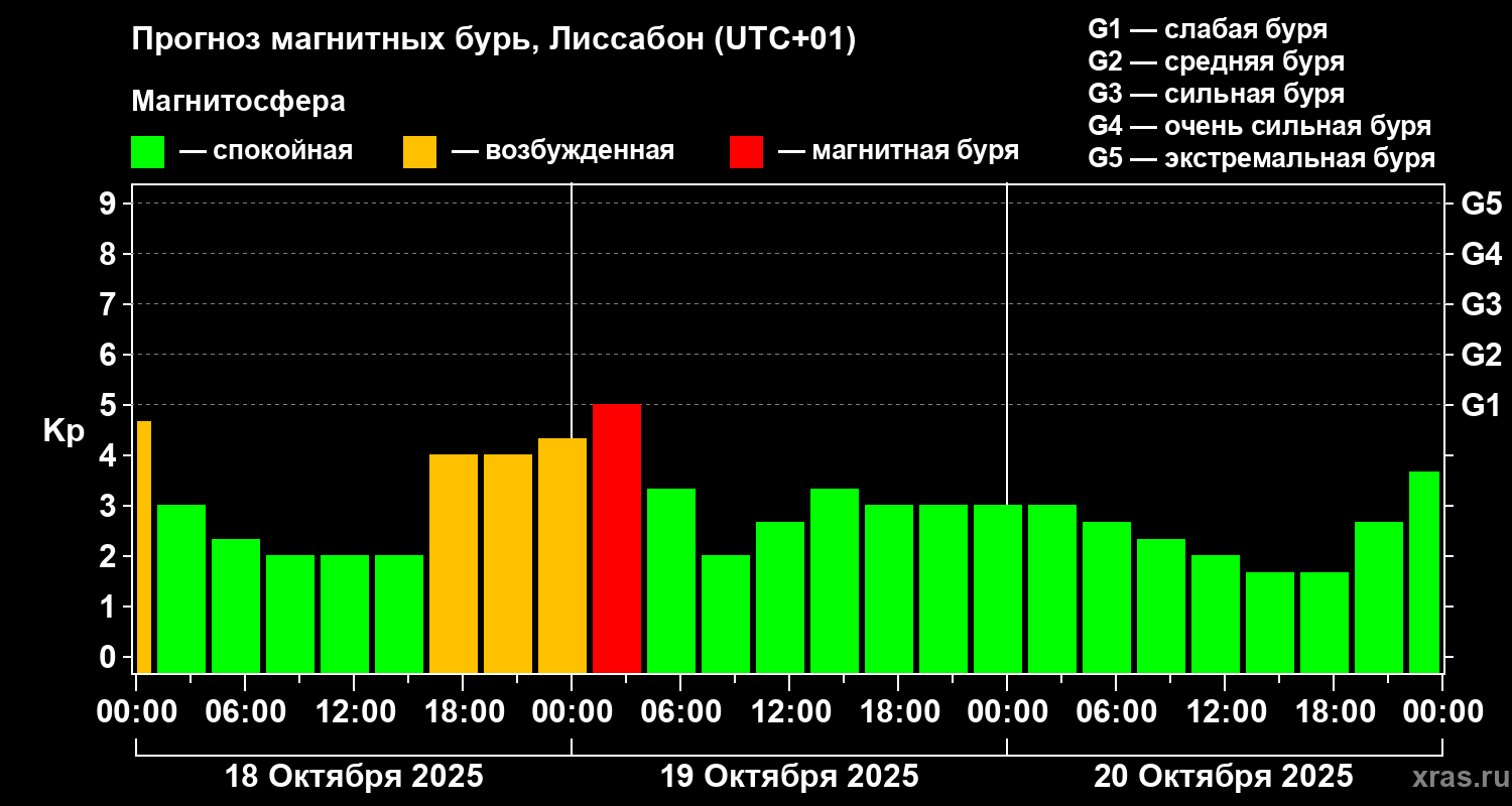 Прогноз магнитных бурь в Лиссабоне — 18 октября 2025 года