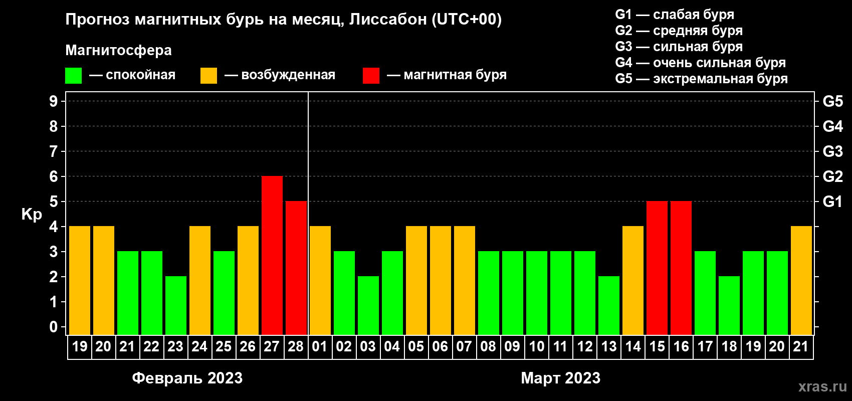 Прогноз максимального суточного геомагнитного индекса Kp на 1 месяц (31 день) с 19 февраля по 21 марта 2023 г
