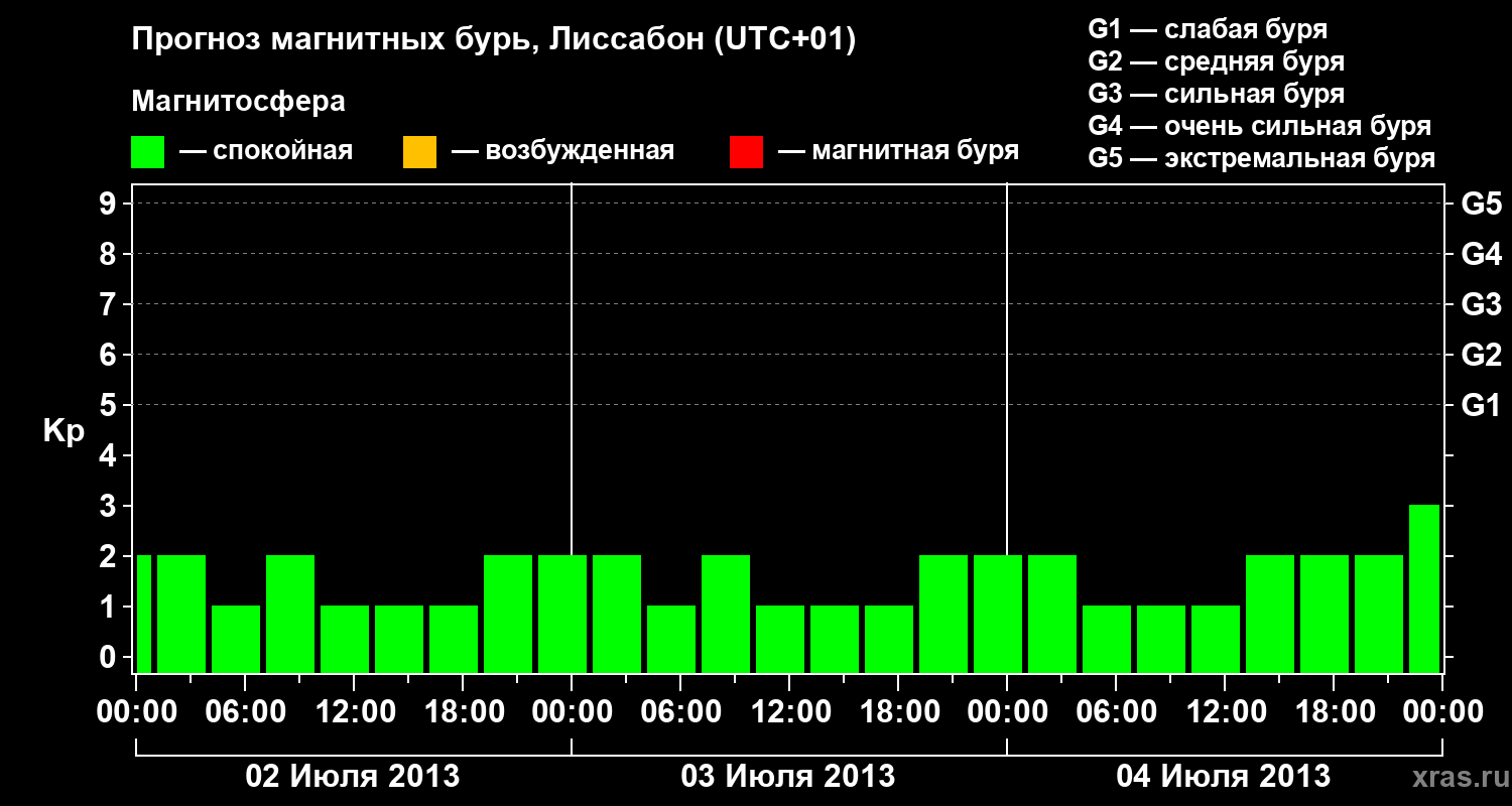 Прогноз магнитных бурь в Лиссабоне — 2 июля 2013 года