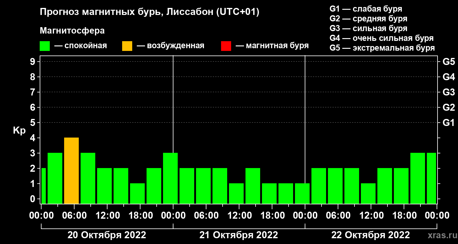 Прогноз магнитных бурь в Лиссабоне на 20 октября 2022 года