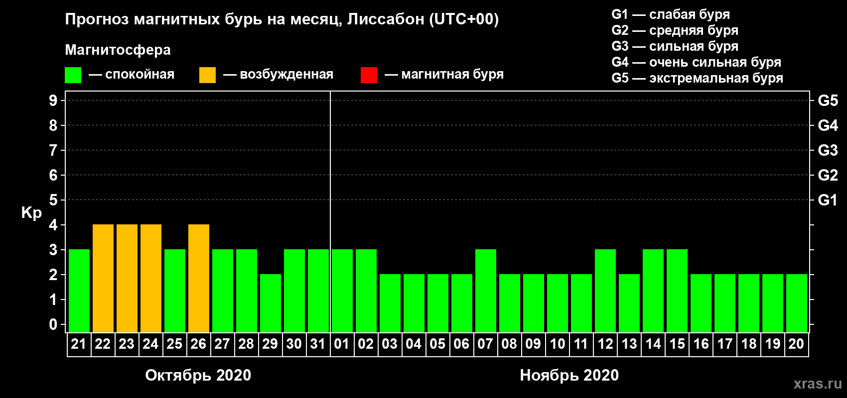 Прогноз магнитных бурь в Лиссабоне — 21 октября 2020 года
