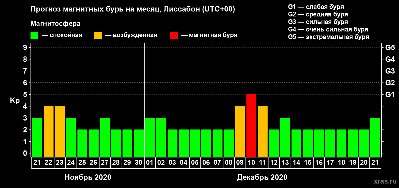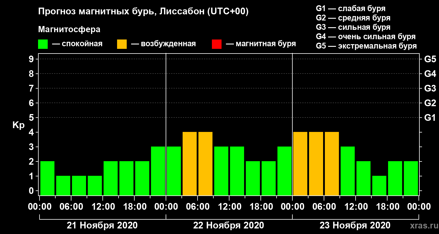 Прогноз магнитных бурь в Лиссабоне — 21 ноября 2020 года