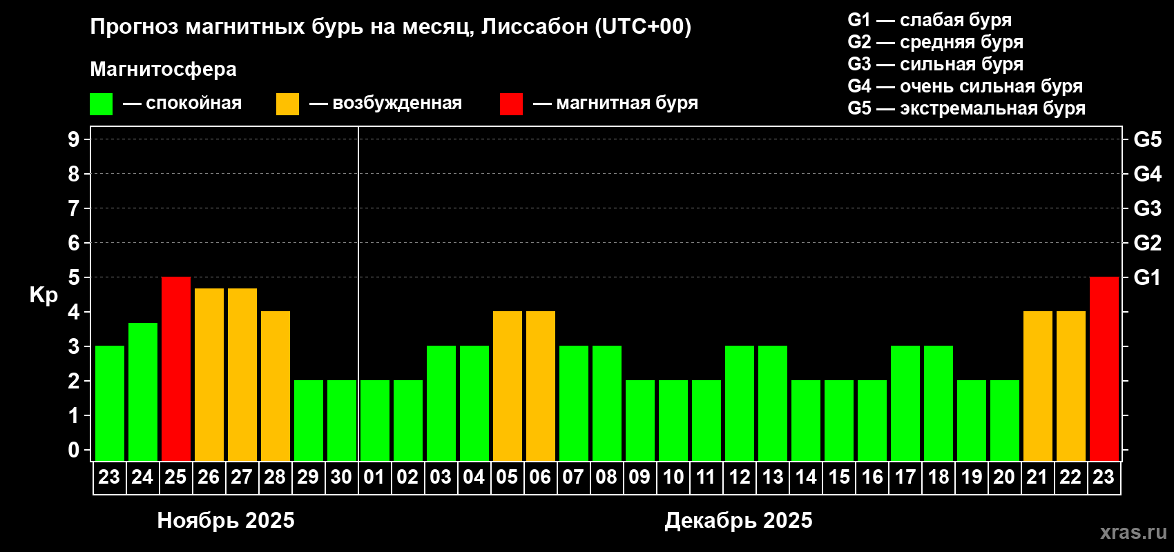 Прогноз магнитных бурь в Лиссабоне — 23 ноября 2025 года
