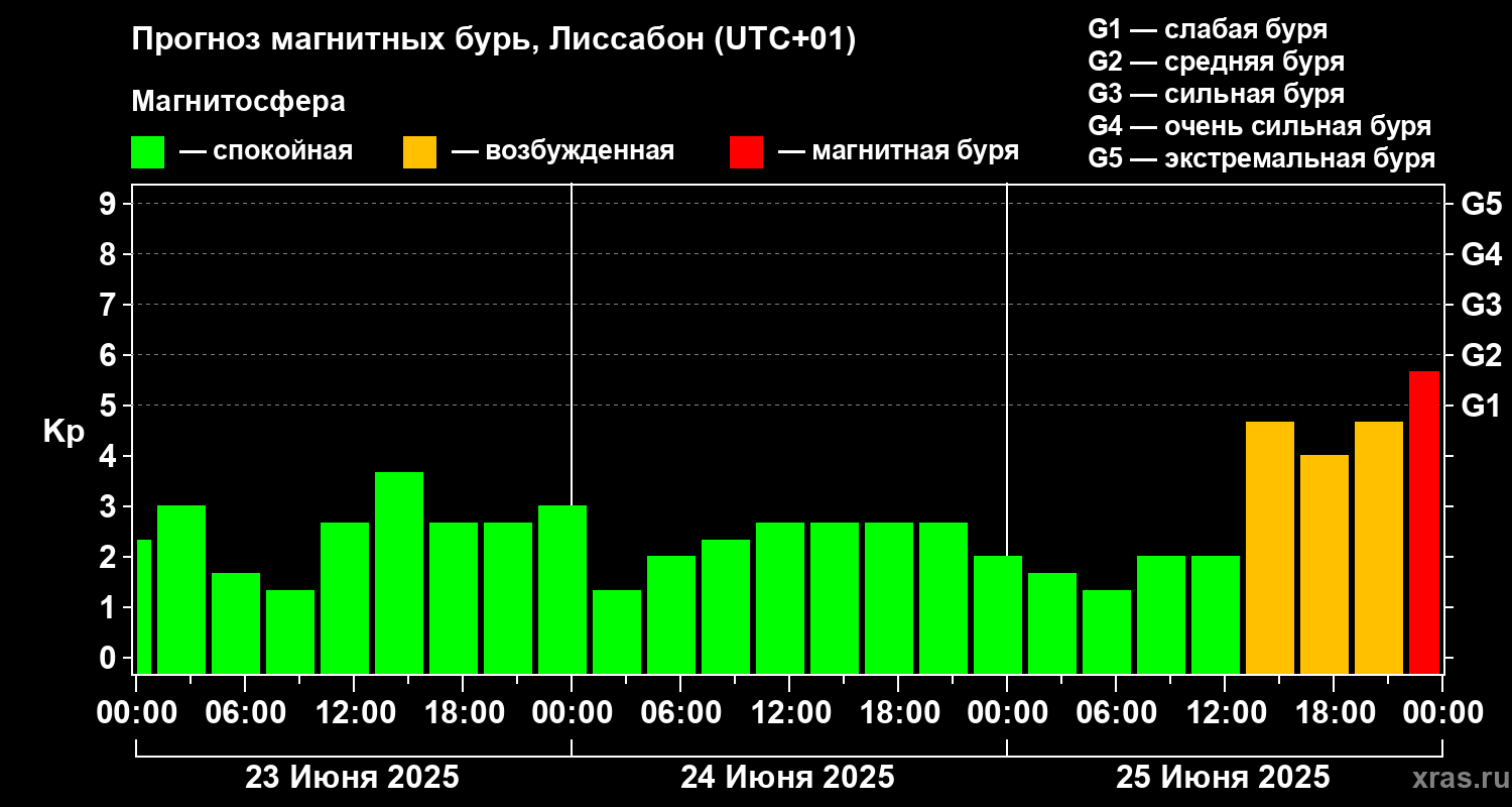 Прогноз магнитных бурь в Лиссабоне — 23 июня 2025 года