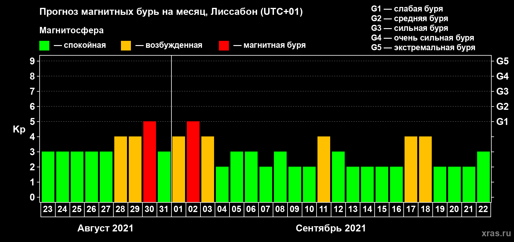 Прогноз магнитных бурь в Лиссабоне на 23 августа 2021 года