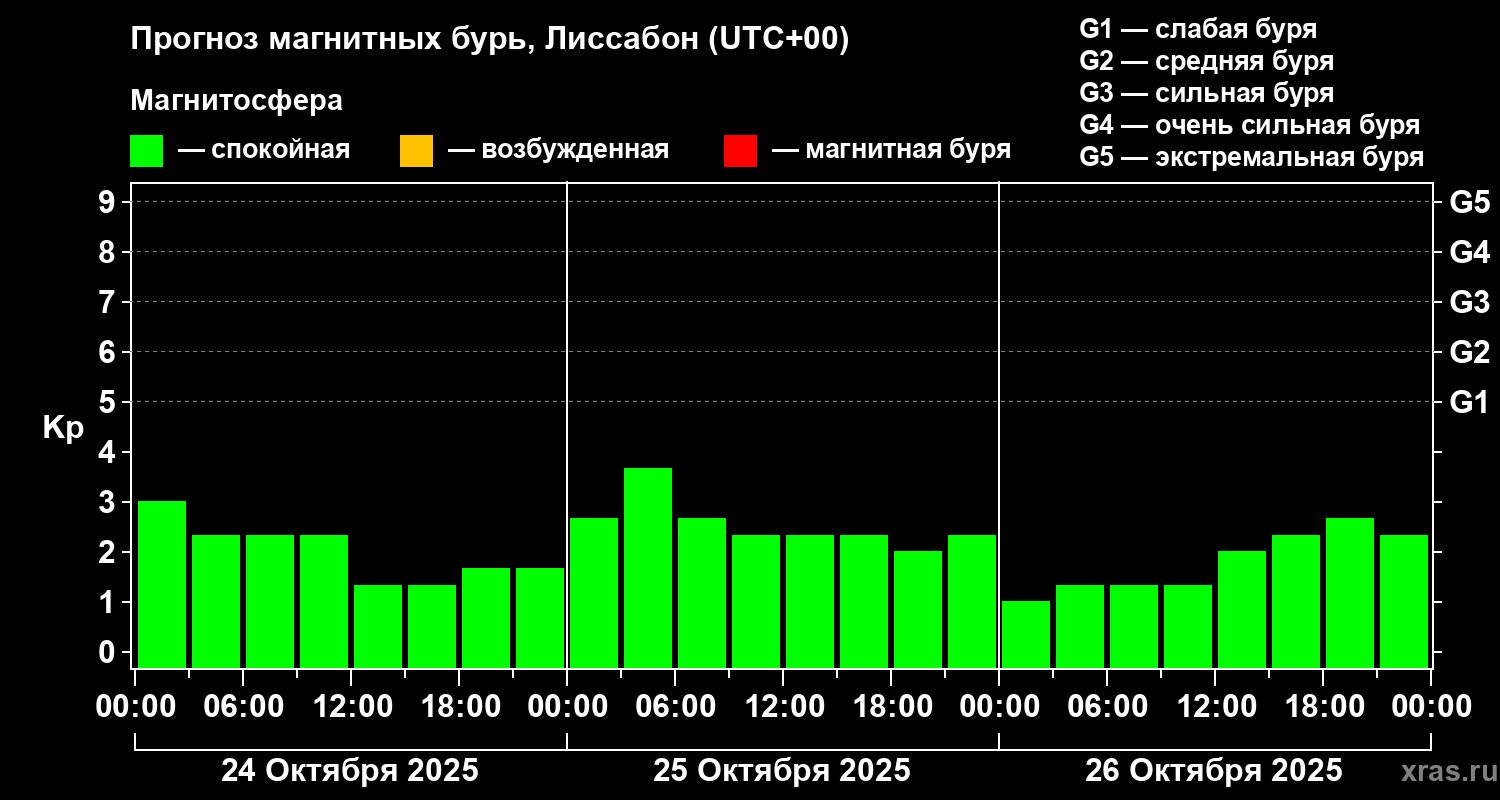 Прогноз магнитных бурь в Лиссабоне — 24 октября 2025 года