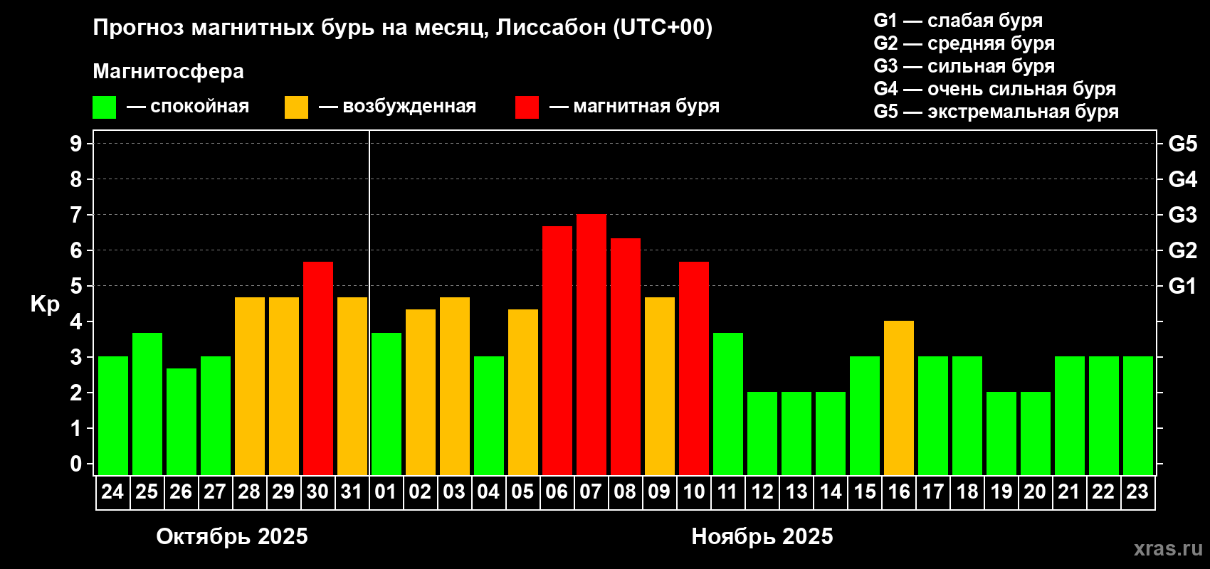 Прогноз максимального суточного геомагнитного индекса Kp на 1 месяц (31 день) с 24 октября по 23 ноября 2025 г