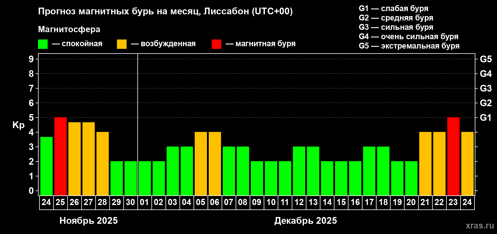 Прогноз магнитных бурь в Лиссабоне — 24 ноября 2025 года