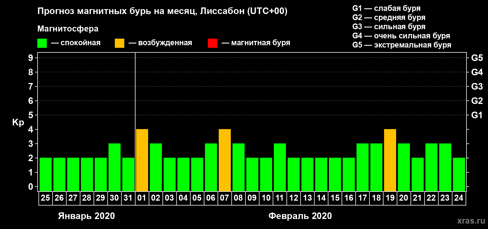 Прогноз магнитных бурь в Лиссабоне — 25 января 2020 года