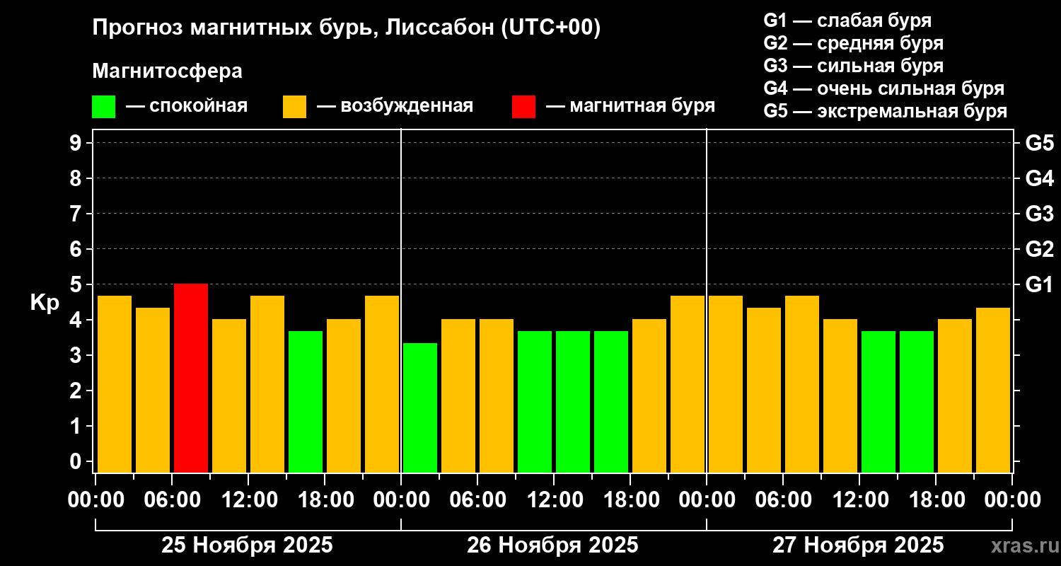 Прогноз магнитных бурь в Лиссабоне — 25 ноября 2025 года