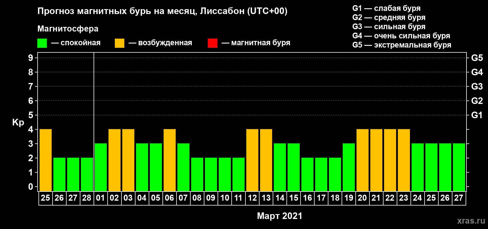 Прогноз максимального суточного геомагнитного индекса Kp на 1 месяц (31 день) с 25 февраля по 27 марта 2021 г