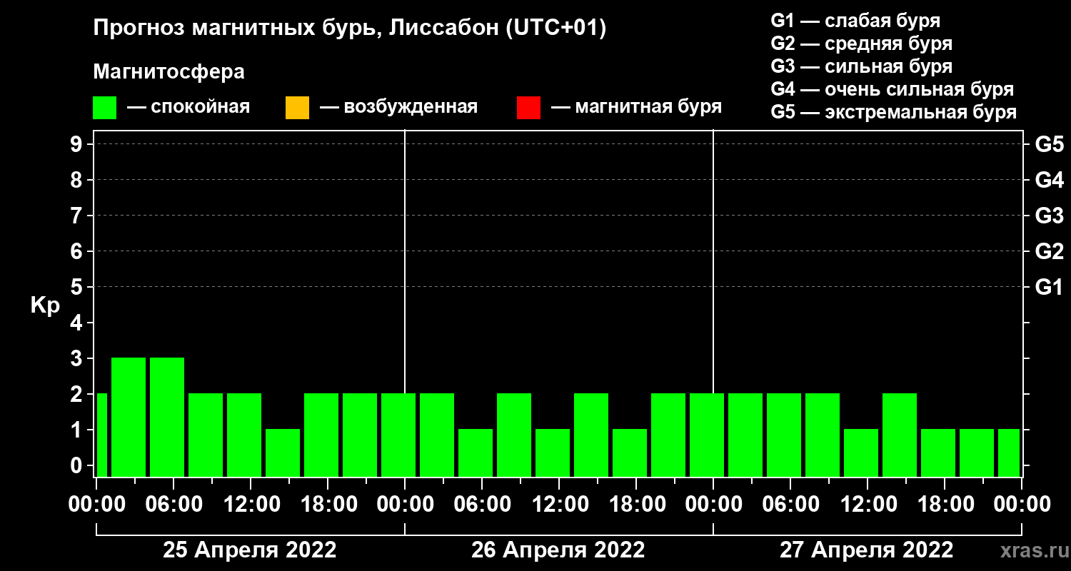 Прогноз магнитных бурь в Лиссабоне — 25 апреля 2022 года