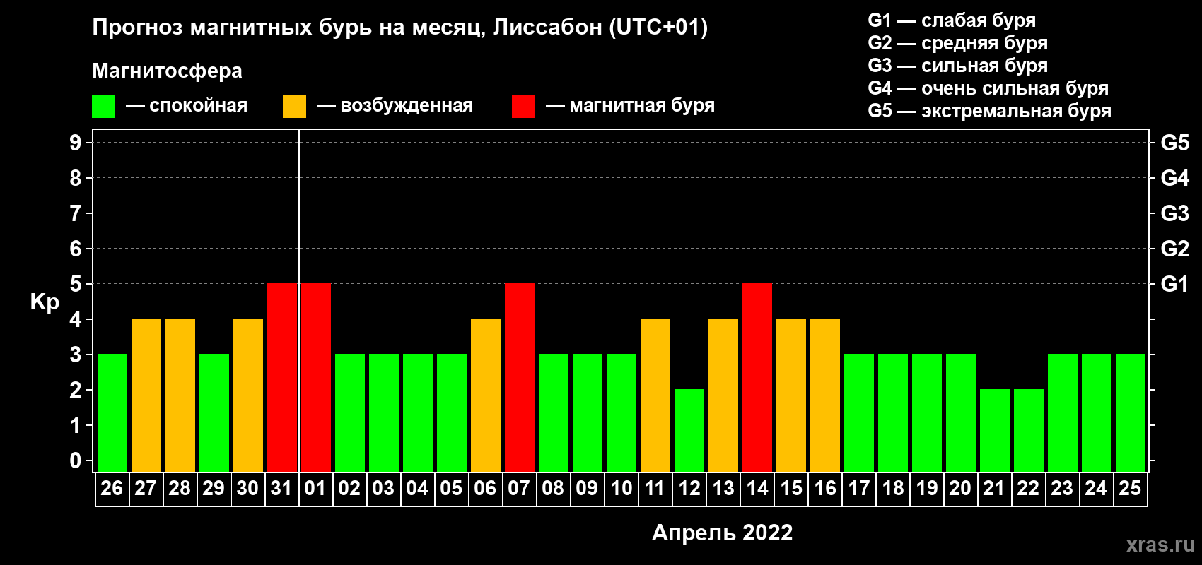 Прогноз максимального суточного геомагнитного индекса Kp на 1 месяц (31 день) с 26 марта по 25 апреля 2022 г
