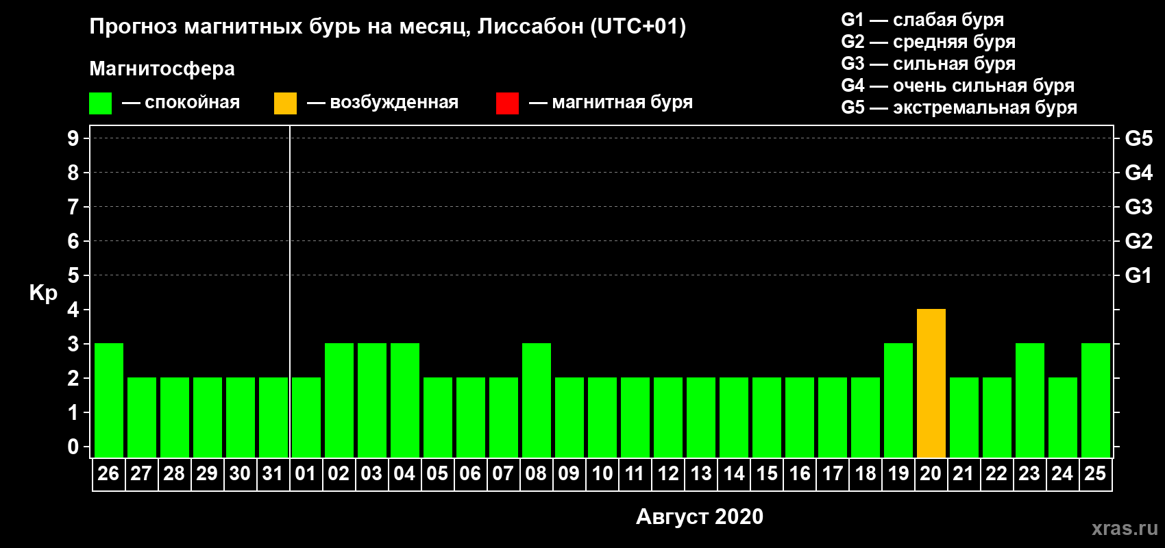 Прогноз максимального суточного геомагнитного индекса Kp на 1 месяц (31 день) с 26 июля по 25 августа 2020 г