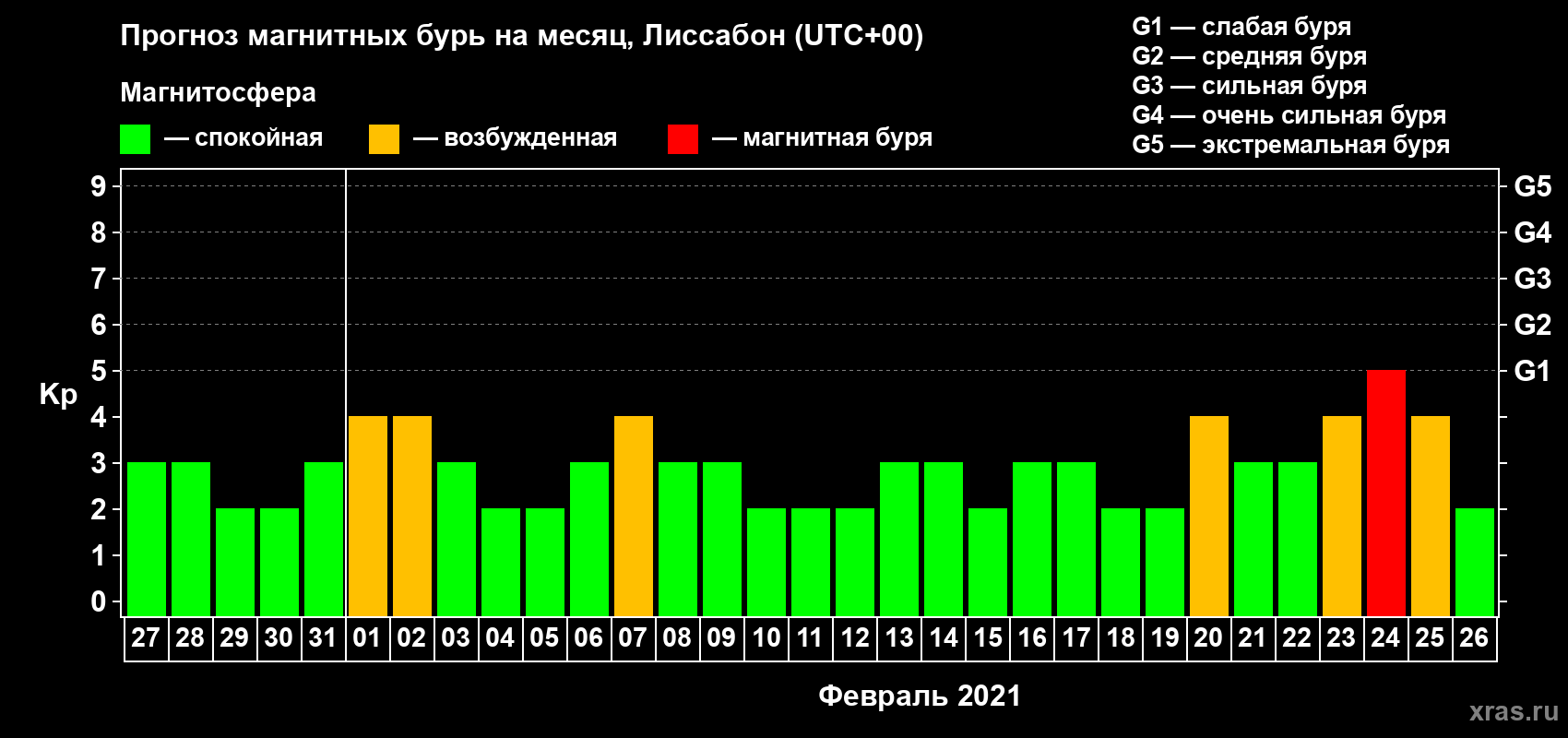 Прогноз максимального суточного геомагнитного индекса Kp на 1 месяц (31 день) с 27 января по 26 февраля 2021 г
