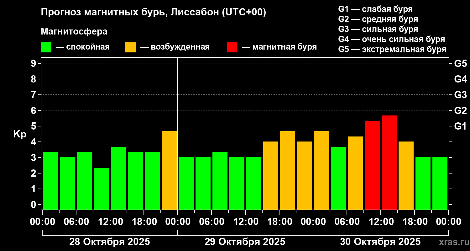 Прогноз магнитных бурь в Лиссабоне — 28 октября 2025 года
