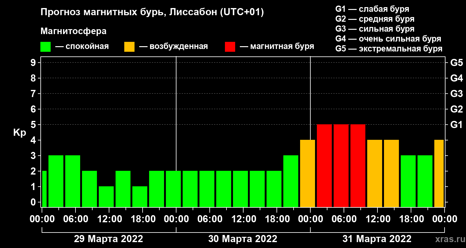 Прогноз магнитных бурь в Лиссабоне — 29 марта 2022 года