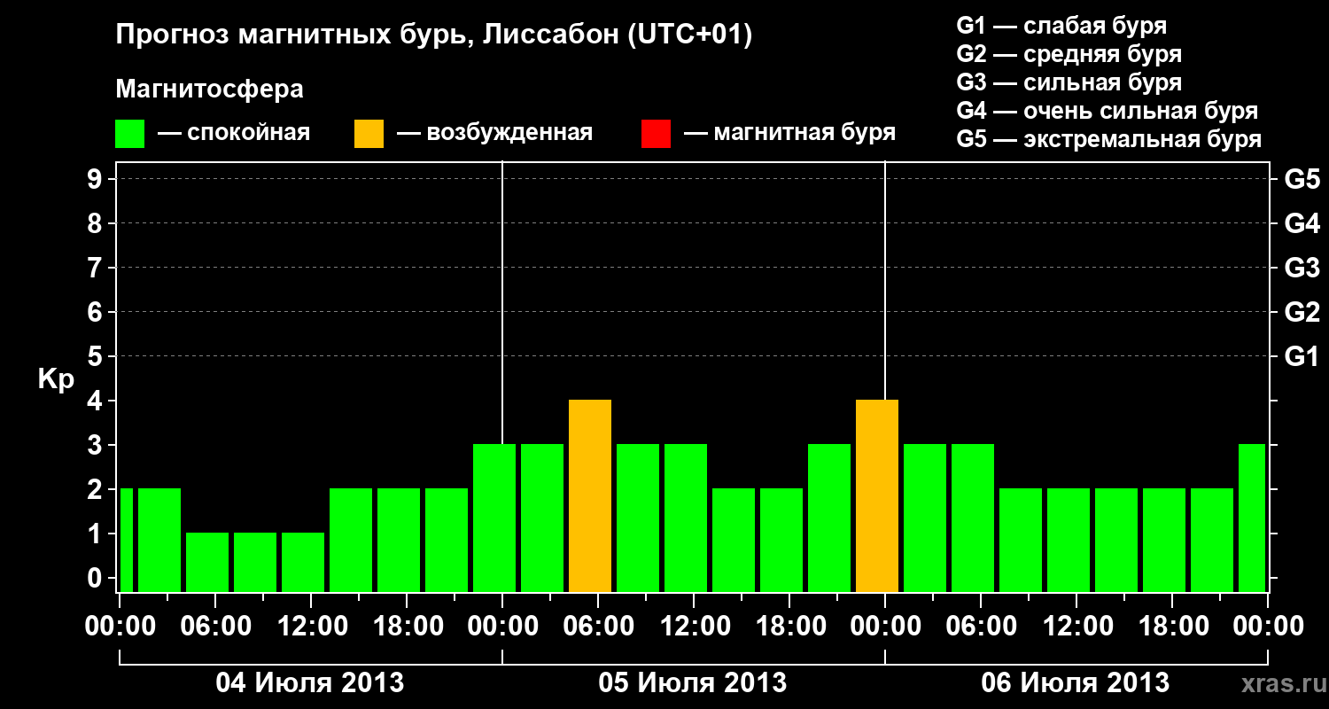 Прогноз магнитных бурь в Лиссабоне — 4 июля 2013 года