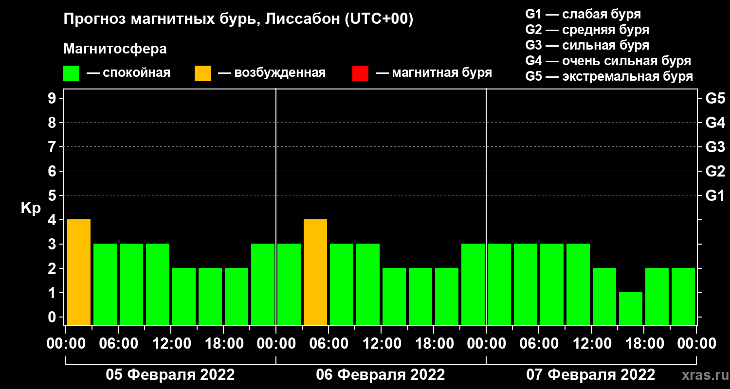 Прогноз магнитных бурь в Лиссабоне на 5 февраля 2022 года