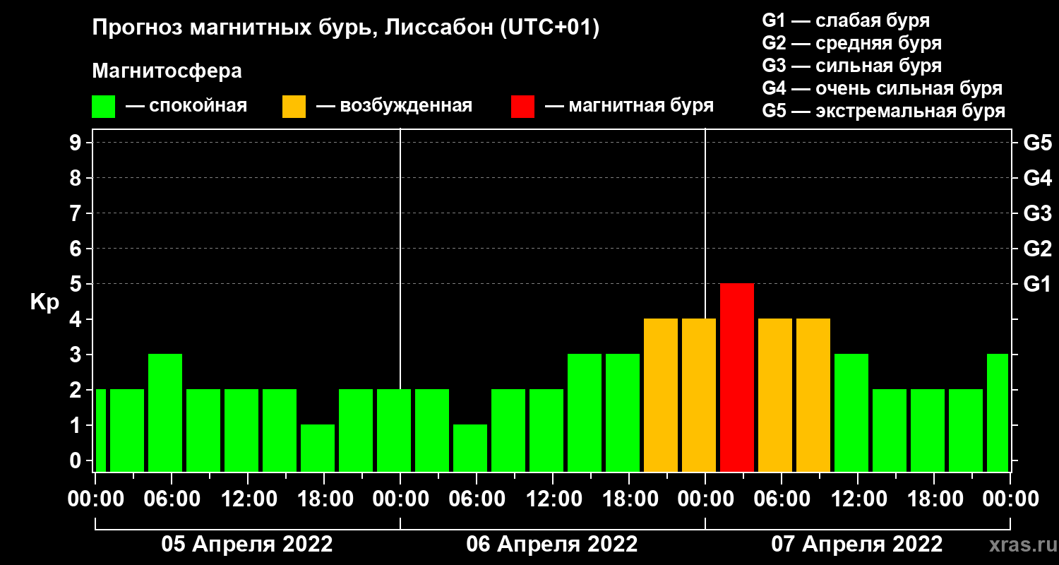 Прогноз магнитных бурь в Лиссабоне — 5 апреля 2022 года