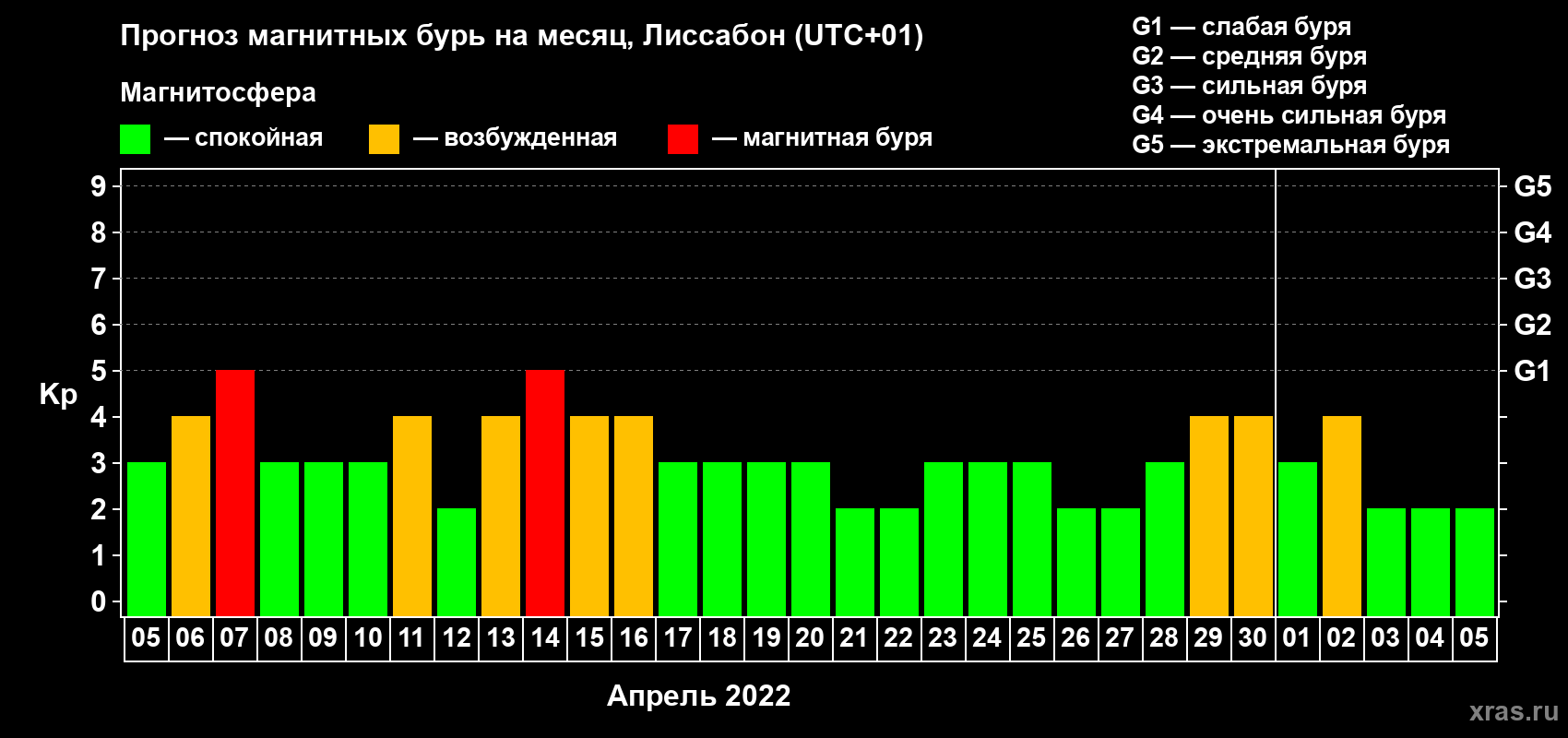 Прогноз магнитных бурь в Лиссабоне на 5 апреля 2022 года