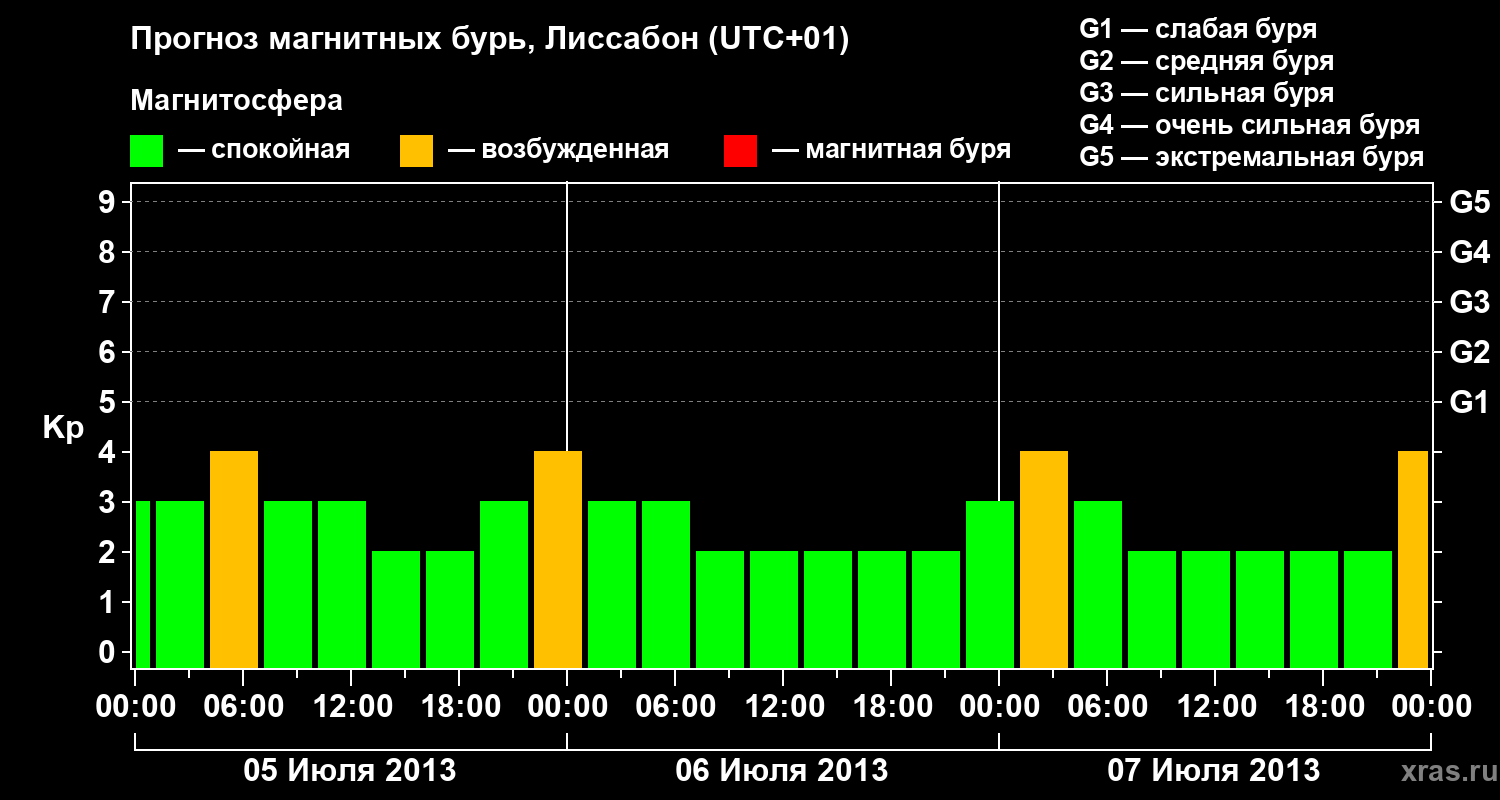 Прогноз магнитных бурь в Лиссабоне — 5 июля 2013 года
