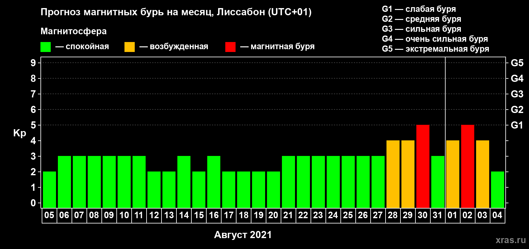 Прогноз магнитных бурь в Лиссабоне на 5 августа 2021 года
