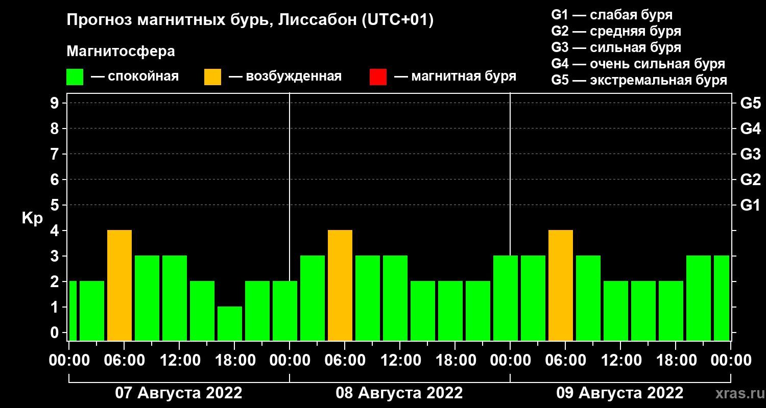 Прогноз магнитных бурь в Лиссабоне — 7 августа 2022 года