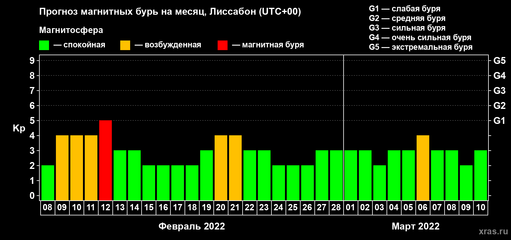 Прогноз максимального суточного геомагнитного индекса Kp на 1 месяц (31 день) с 08 февраля по 10 марта 2022 г