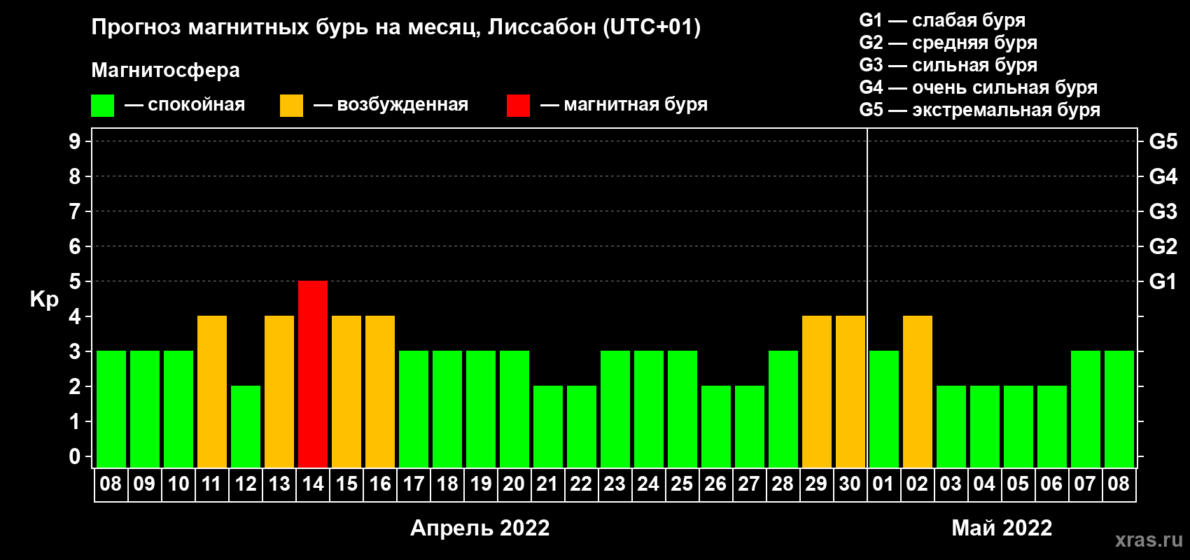 Прогноз магнитных бурь в Лиссабоне на 8 апреля 2022 года