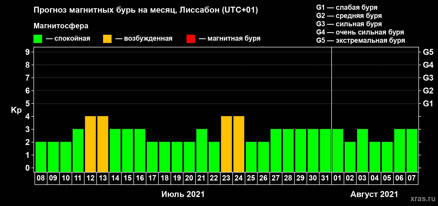 Прогноз магнитных бурь в Лиссабоне — 8 июля 2021 года