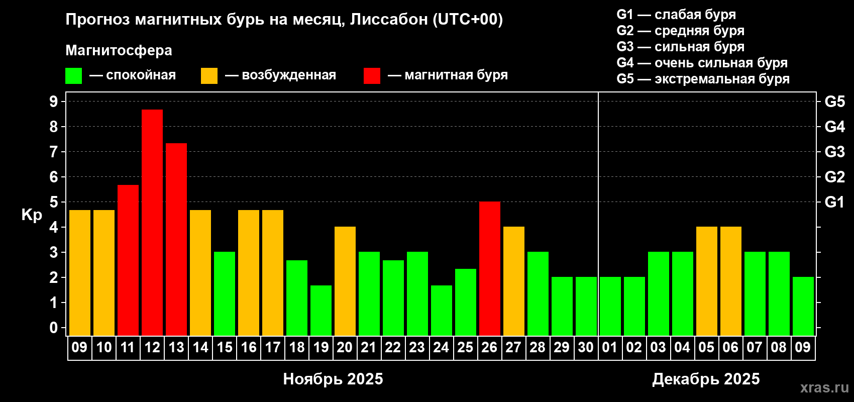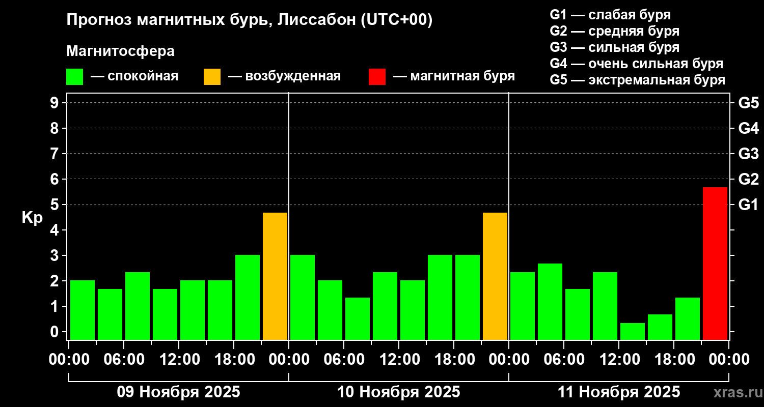 Прогноз магнитных бурь в Лиссабоне на 9 ноября 2025 года