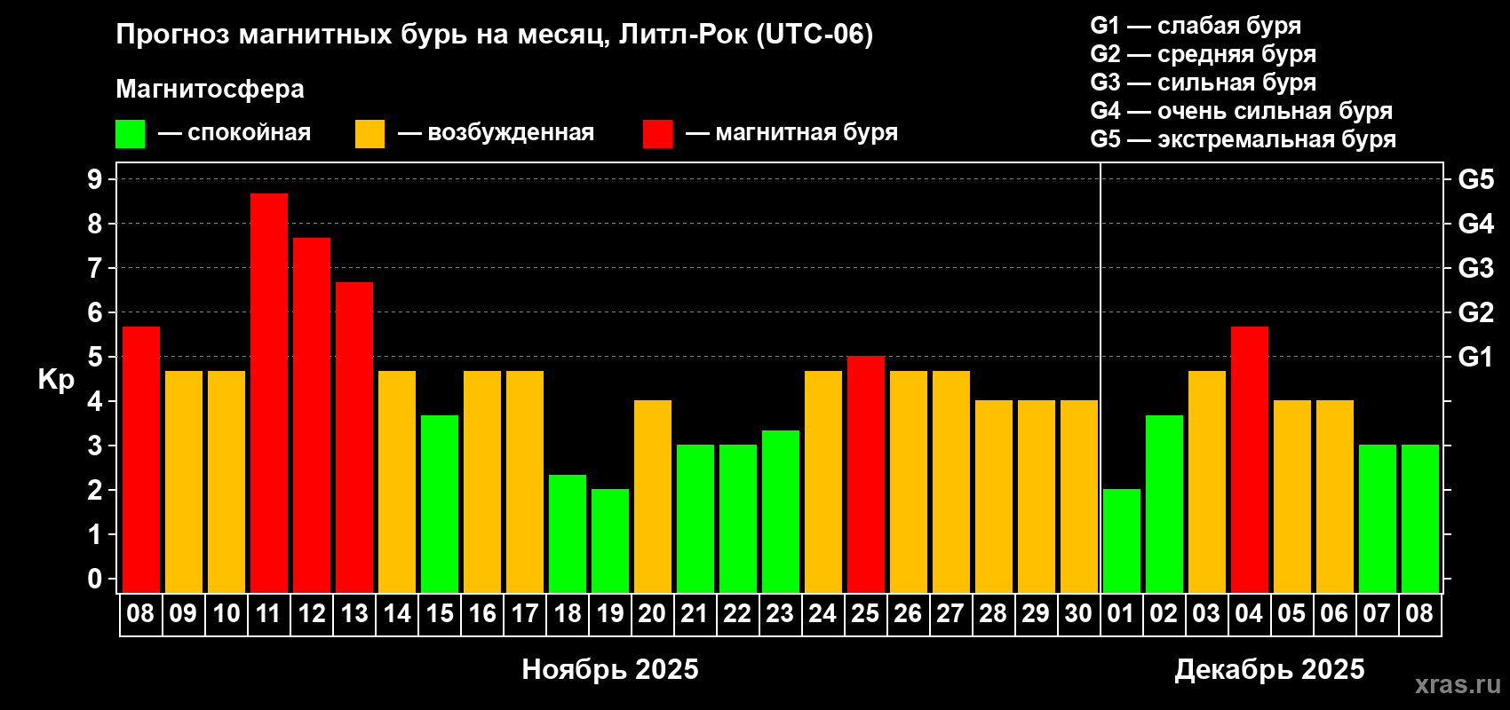 Прогноз магнитных бурь в Литл-Роке на 8 ноября 2025 года