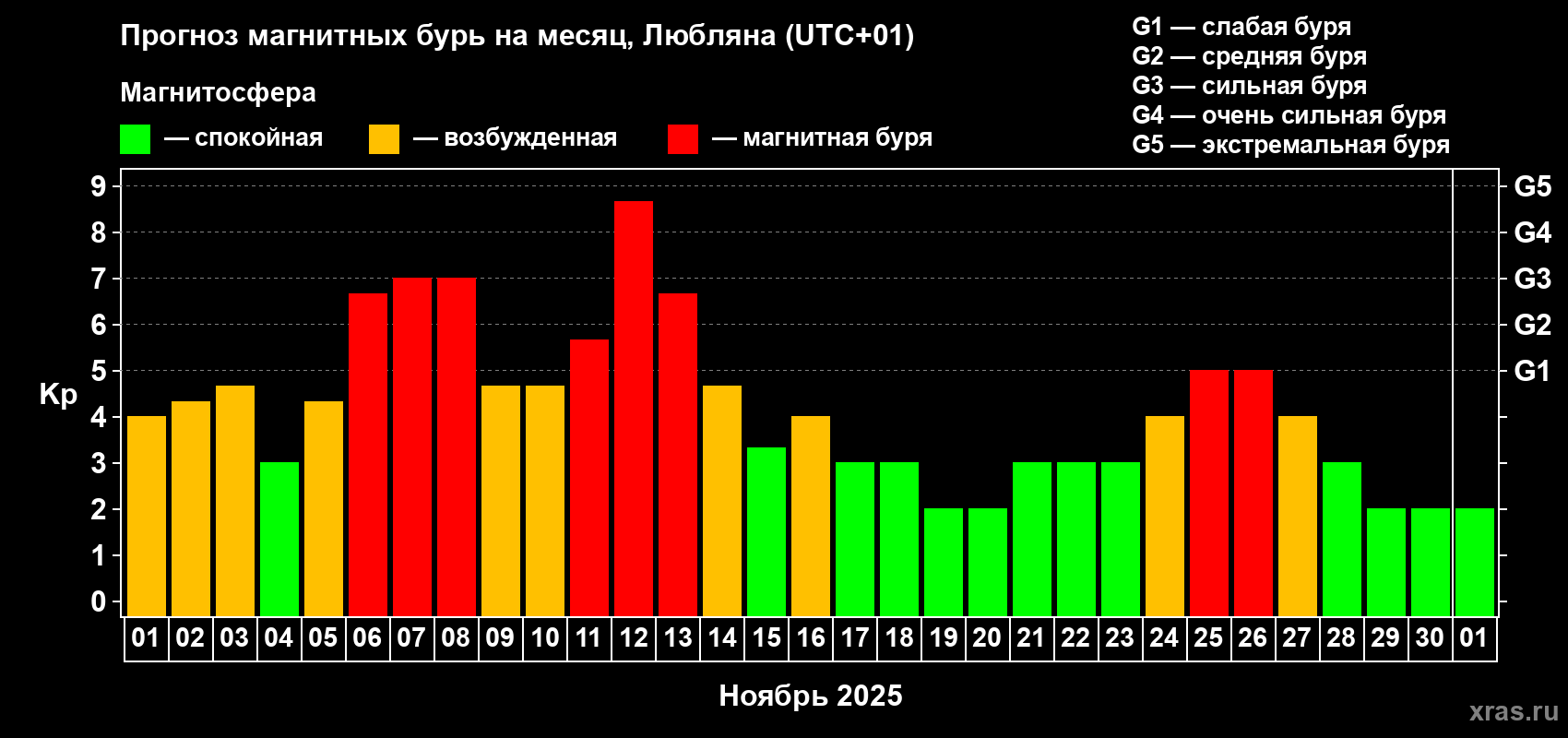 Прогноз магнитных бурь в Любляне — 1 ноября 2025 года