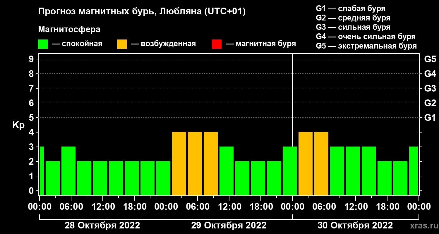 Прогноз магнитных бурь в Любляне — 28 октября 2022 года