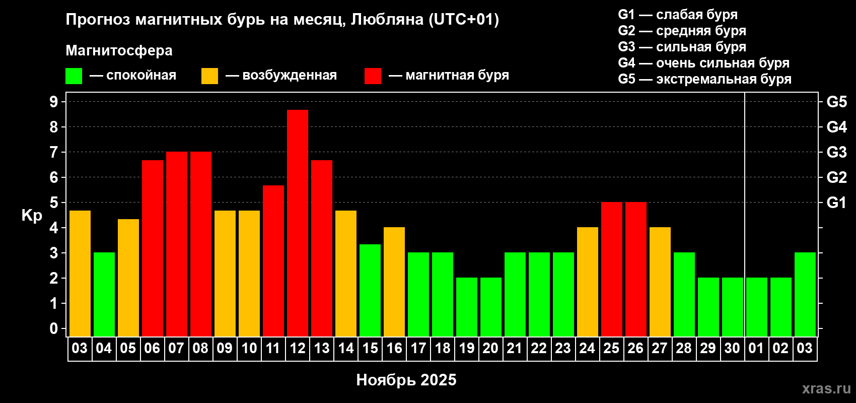 Прогноз магнитных бурь в Любляне — 3 ноября 2025 года