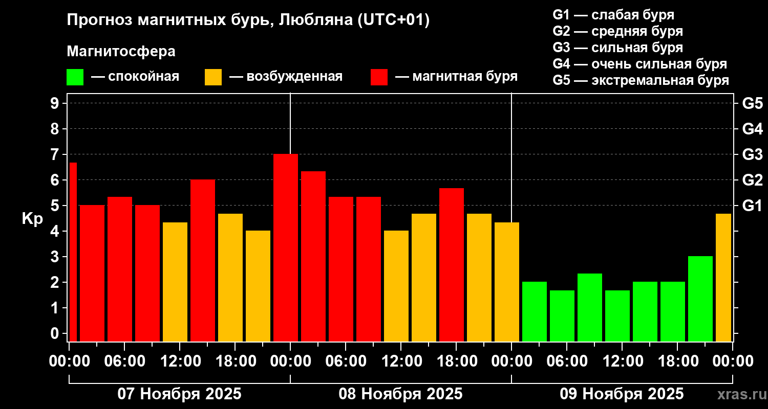Прогноз магнитных бурь в Любляне — 7 ноября 2025 года
