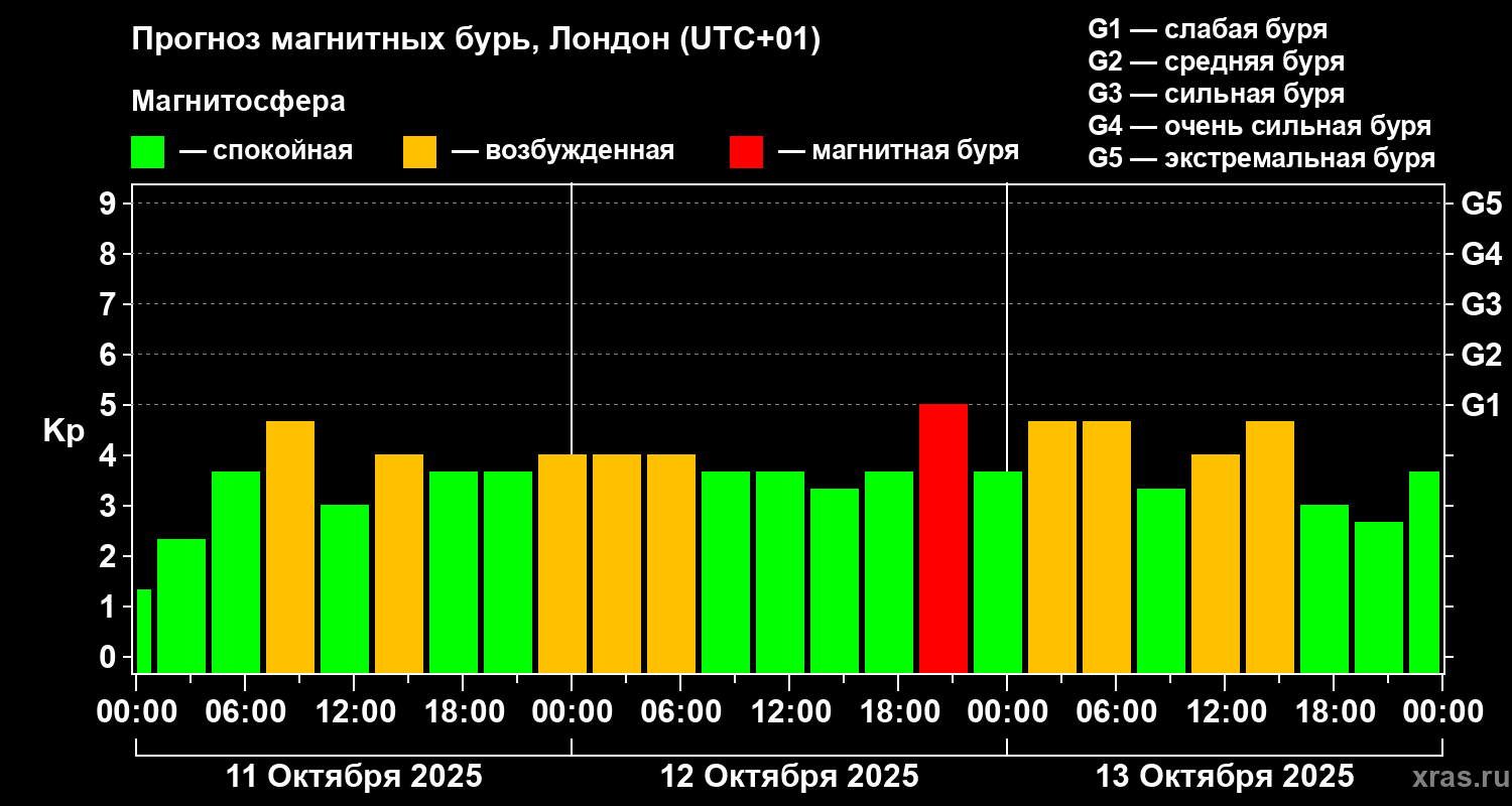 Прогноз магнитных бурь в Лондоне на 11 октября 2025 года