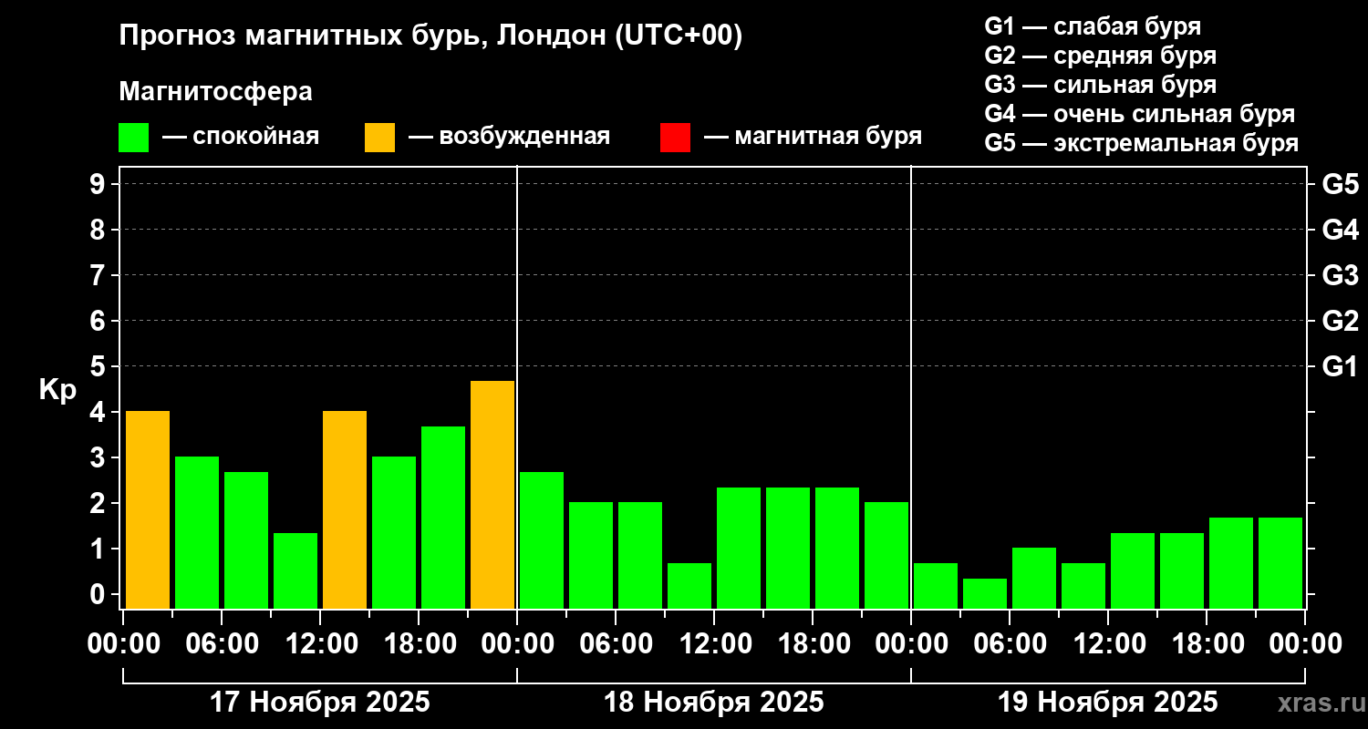 Прогноз магнитных бурь в Лондоне на 17 ноября 2025 года