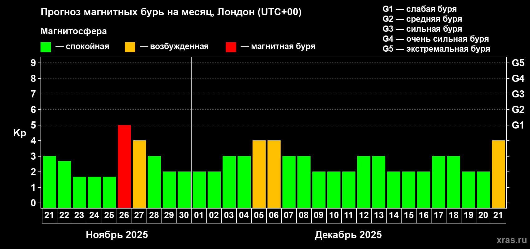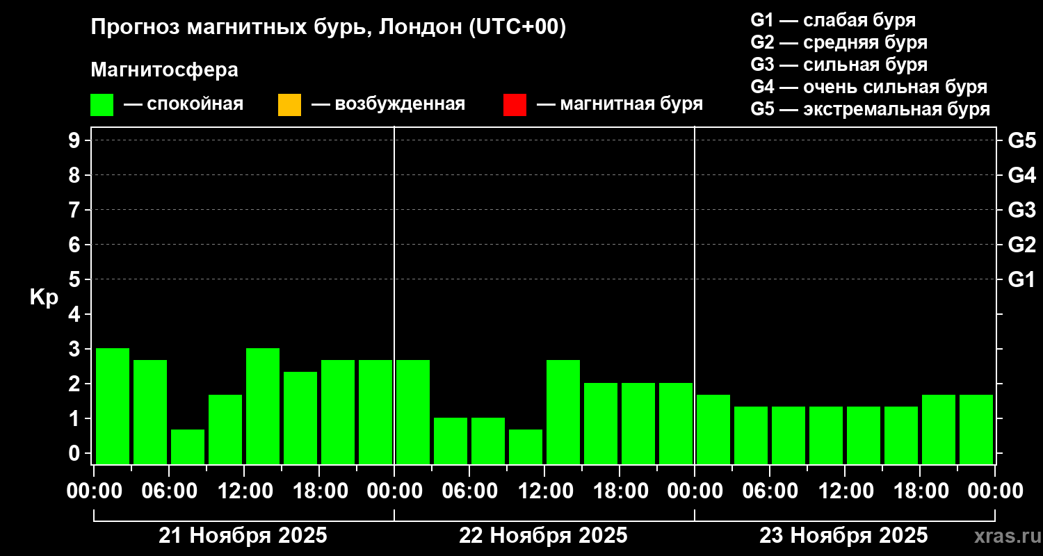 Прогноз магнитных бурь в Лондоне — 21 ноября 2025 года